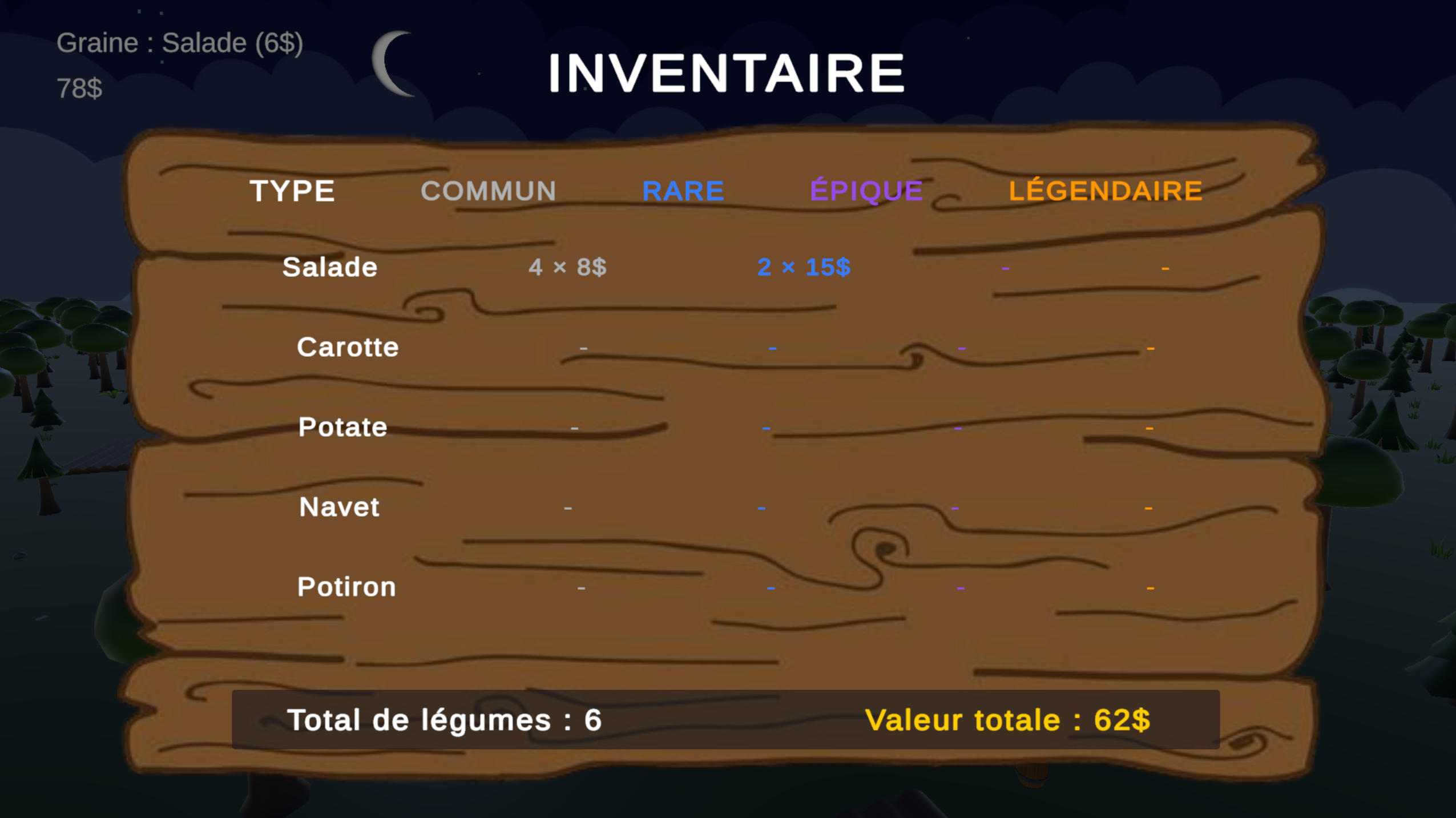 - Commencez avec 120$ et une seule graine débloquée (Salade)